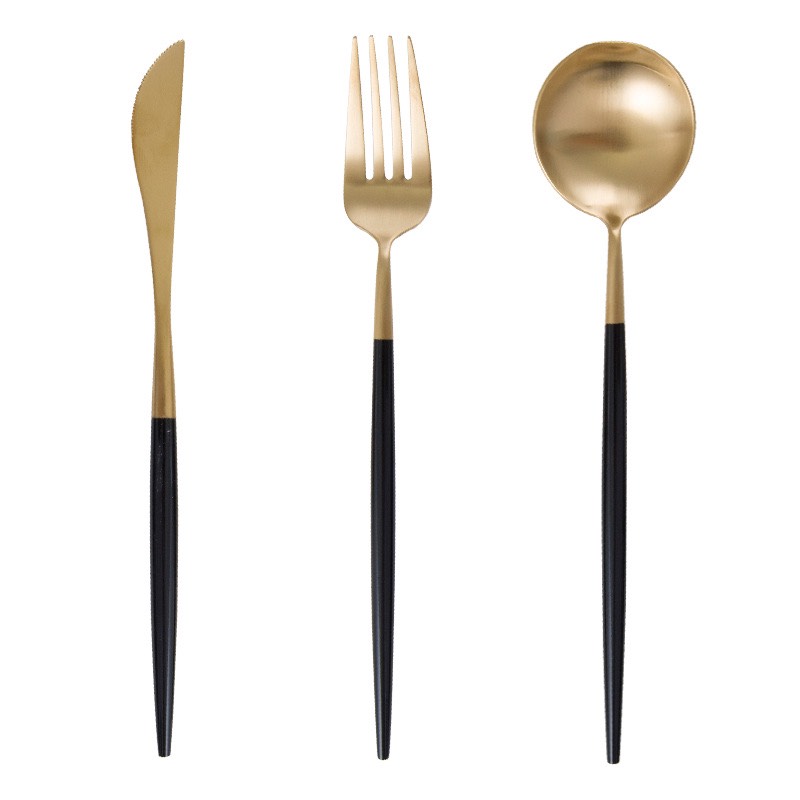 + Sản phẩm được làm từ chất liệu inox với thiết kế đặt biệt mạ vàng và cán tat cầm màu đen theo phong cách Châu Âu